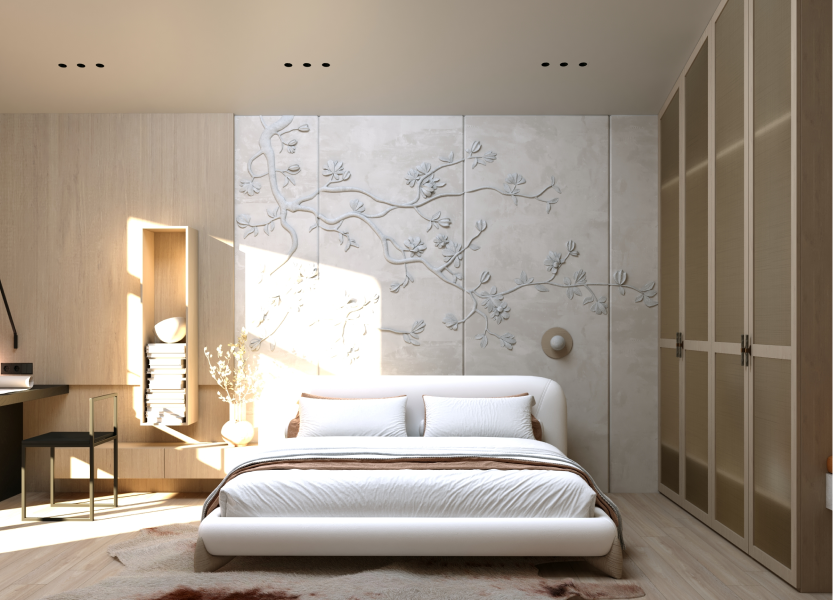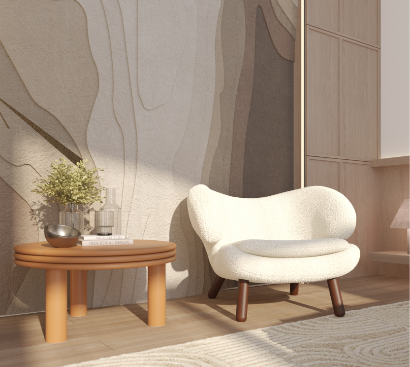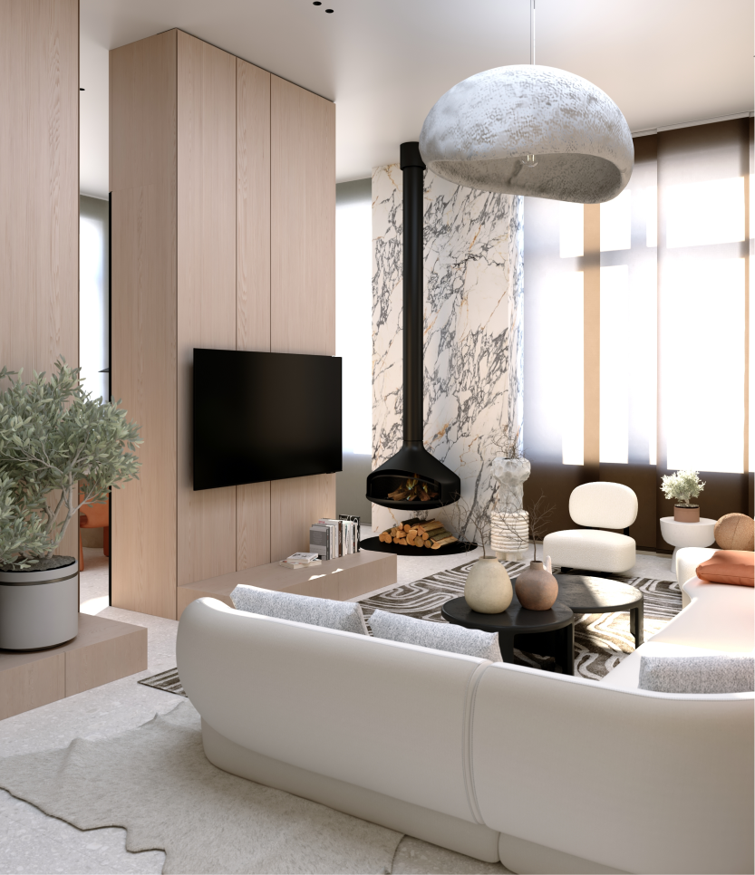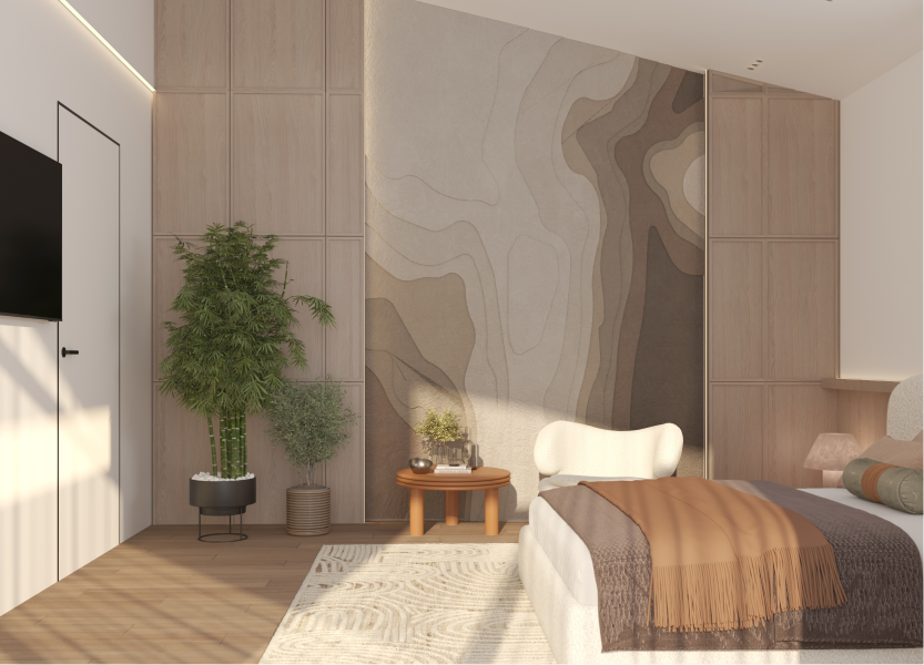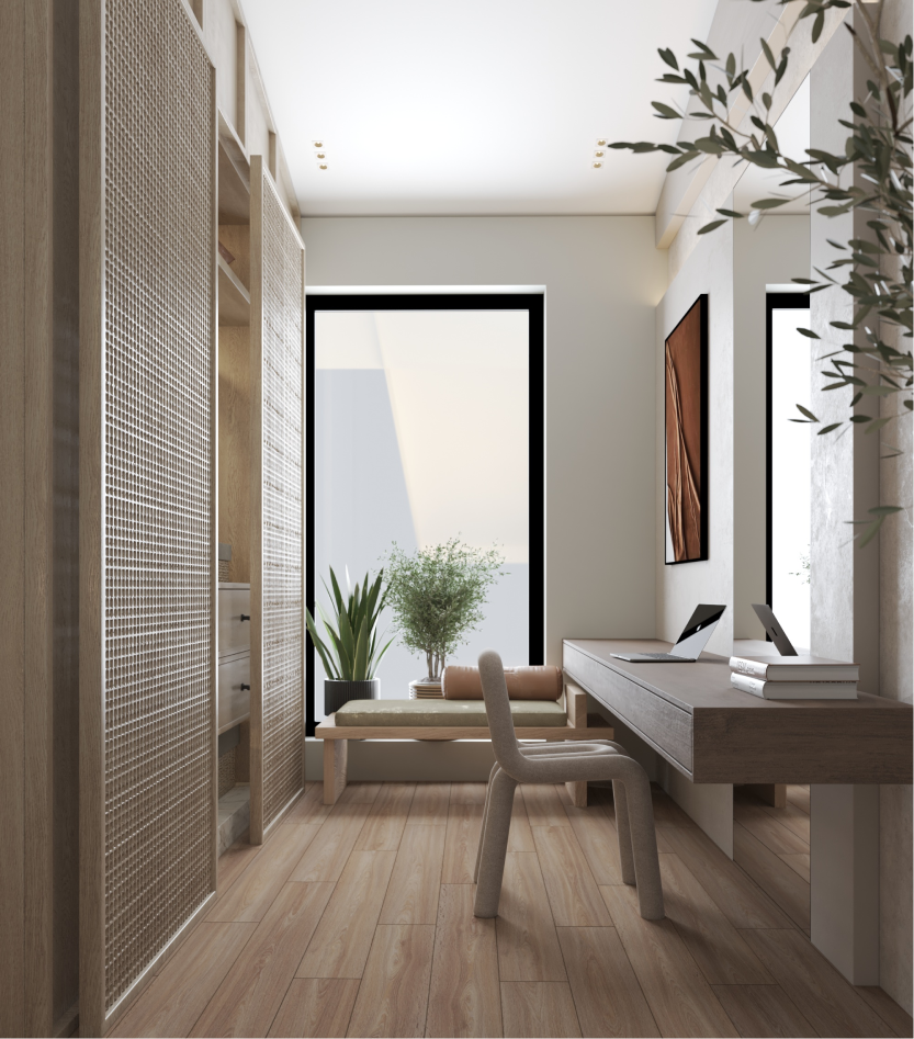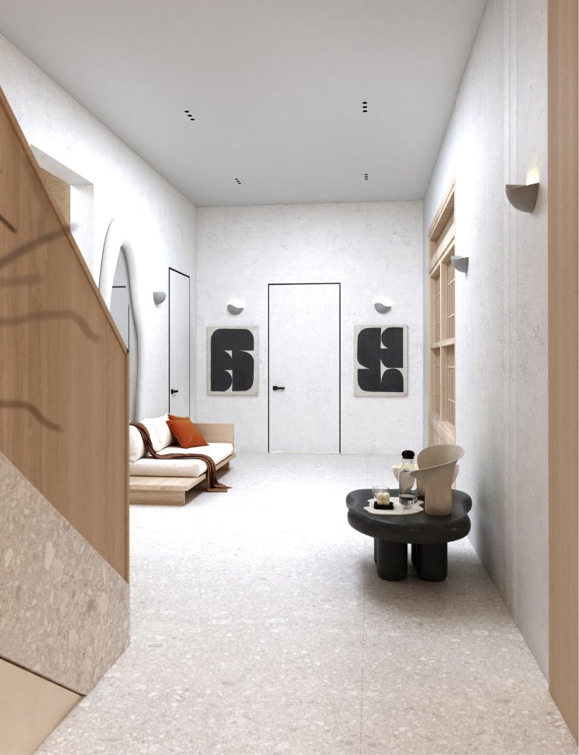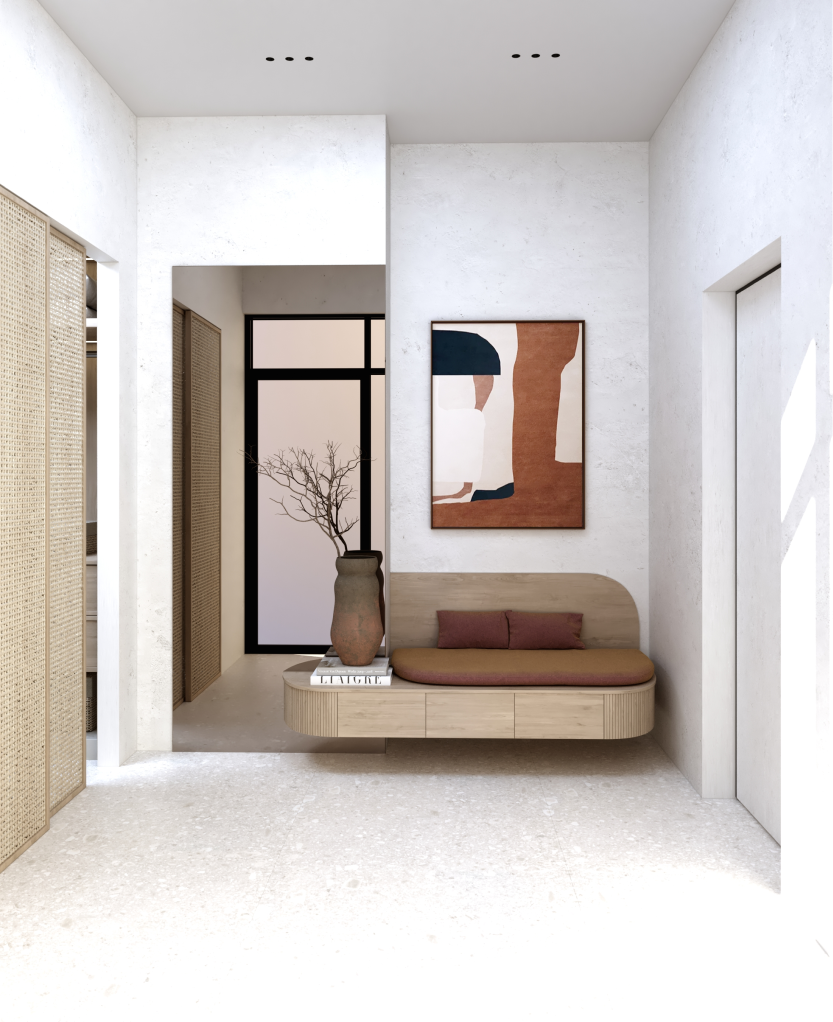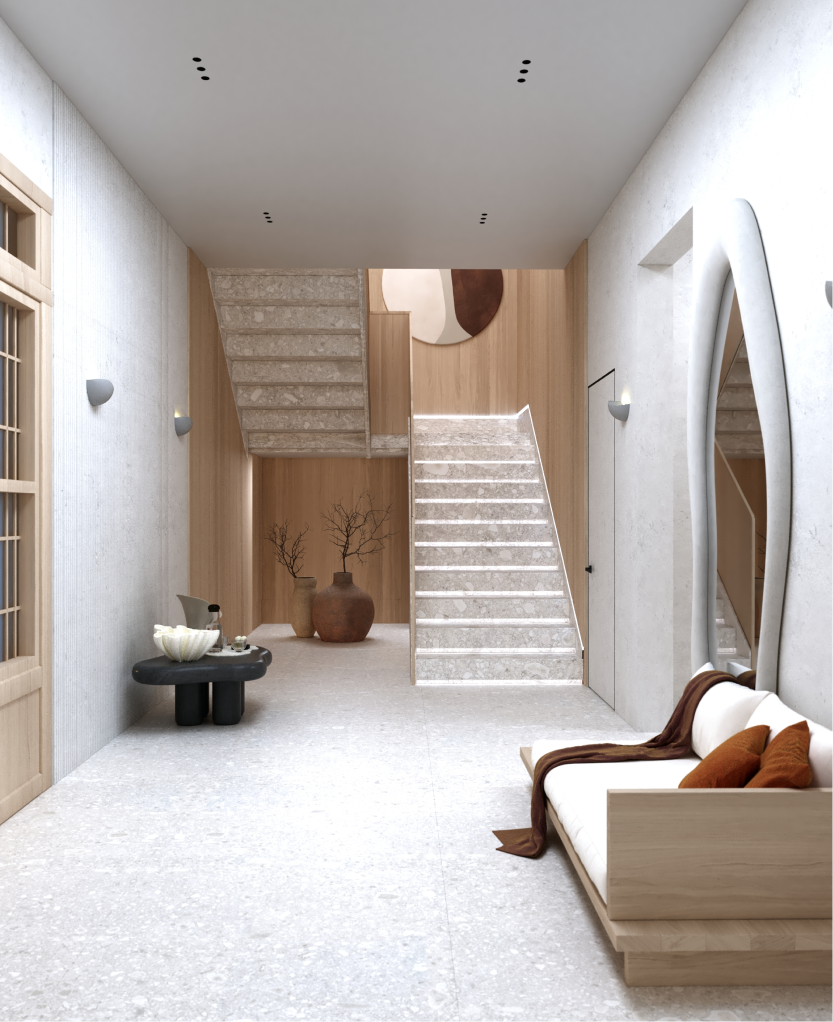 Интерьер дома в стиле джапанди: декоративная штукатурка на стенах, натуральный камень,