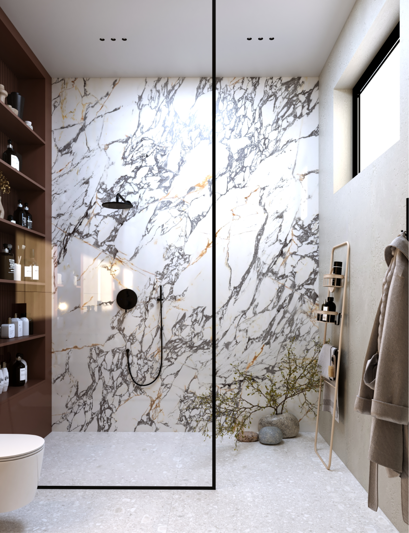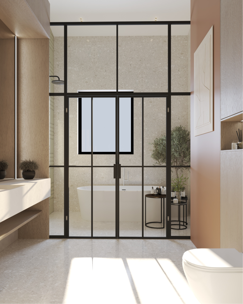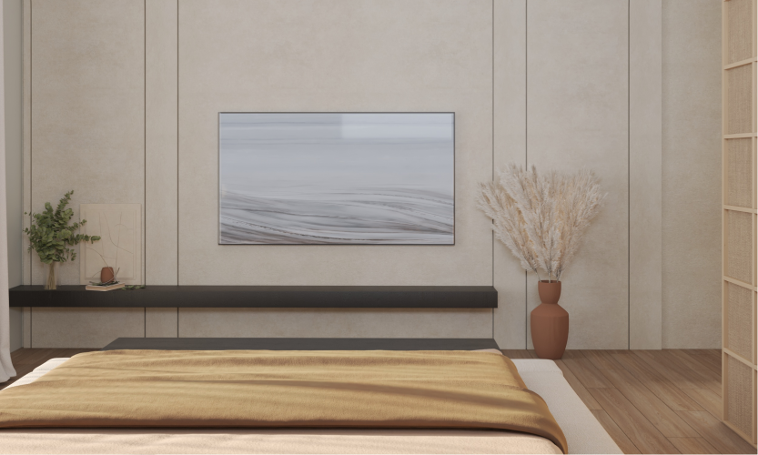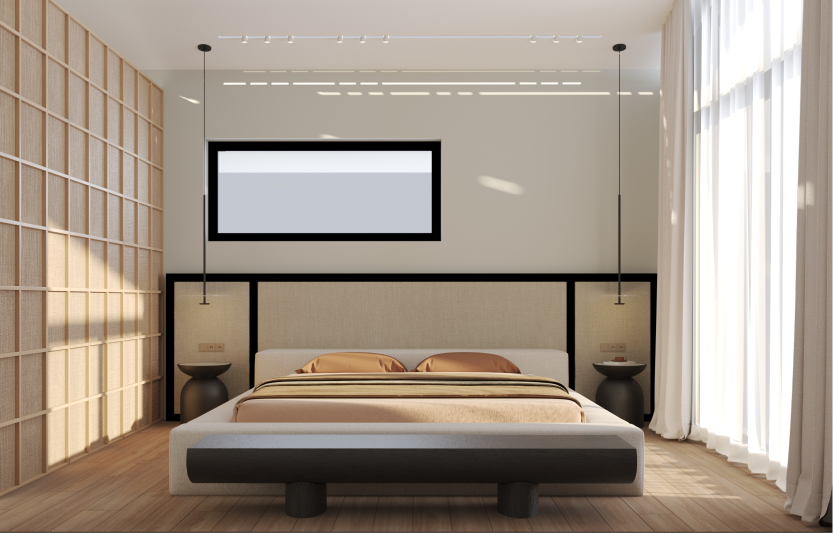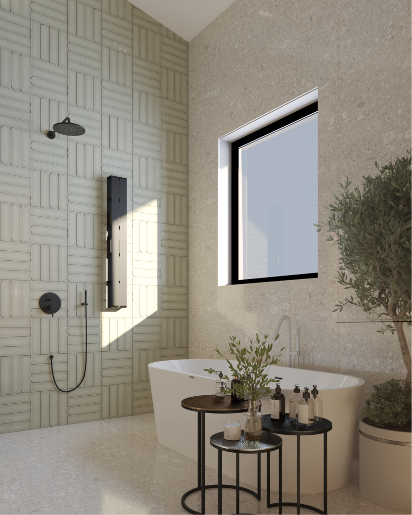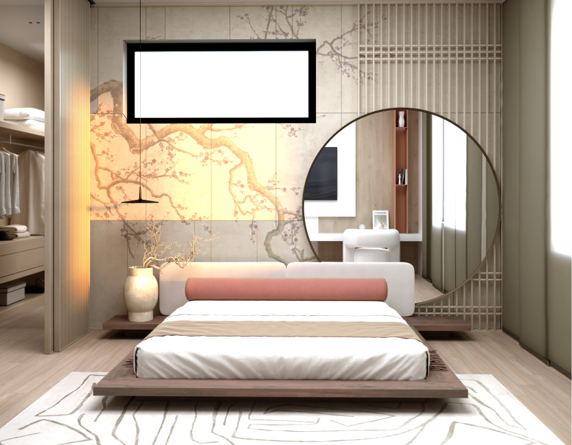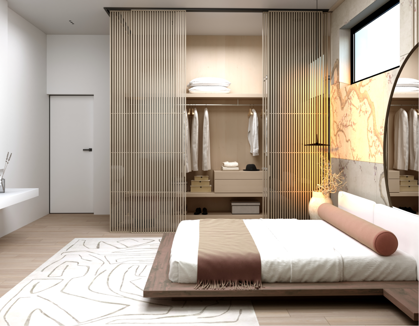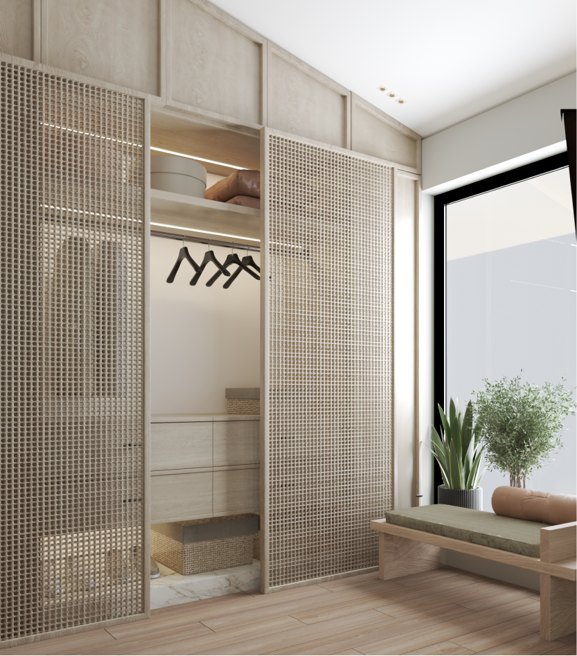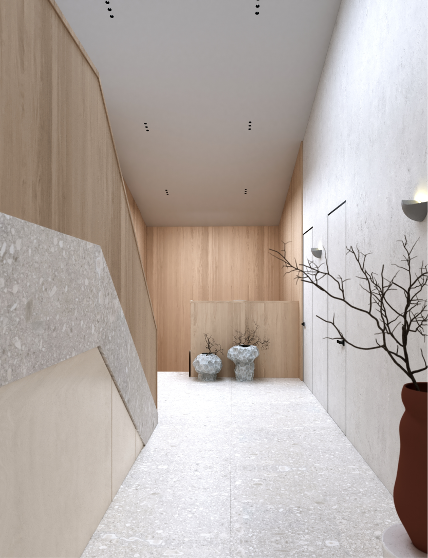 Интерьер дома в стиле джапанди: декоративная штукатурка на стенах, натуральный камень,