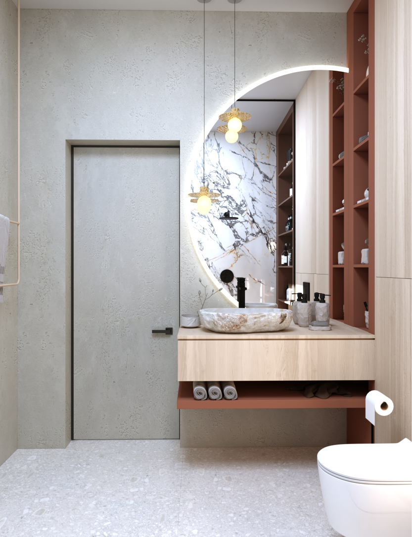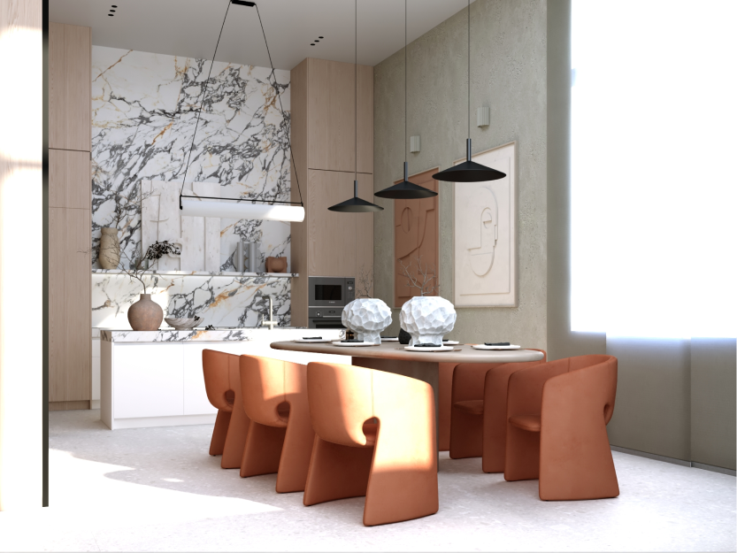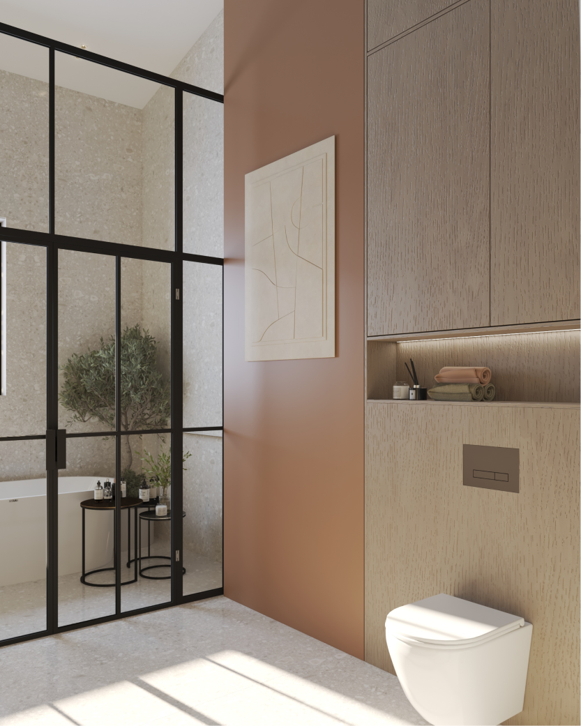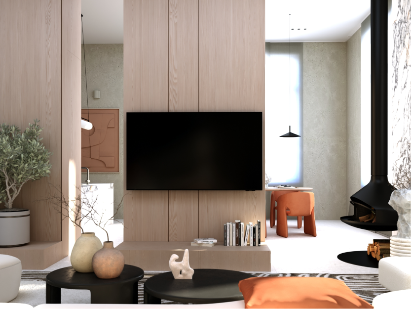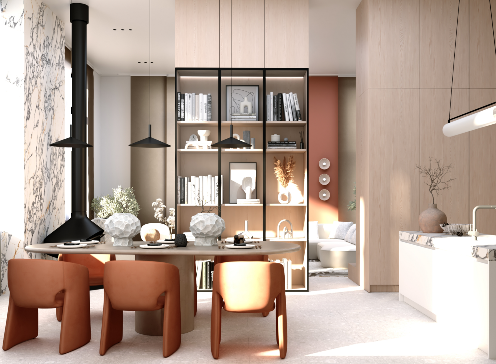 инженерная доска и дерево, а также приглушенные терракотовые акценты придают пространству особый стиль и уют.