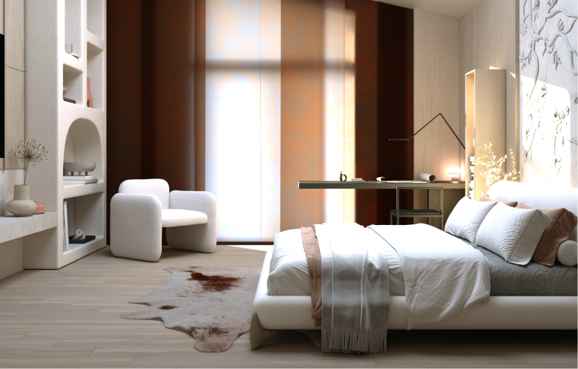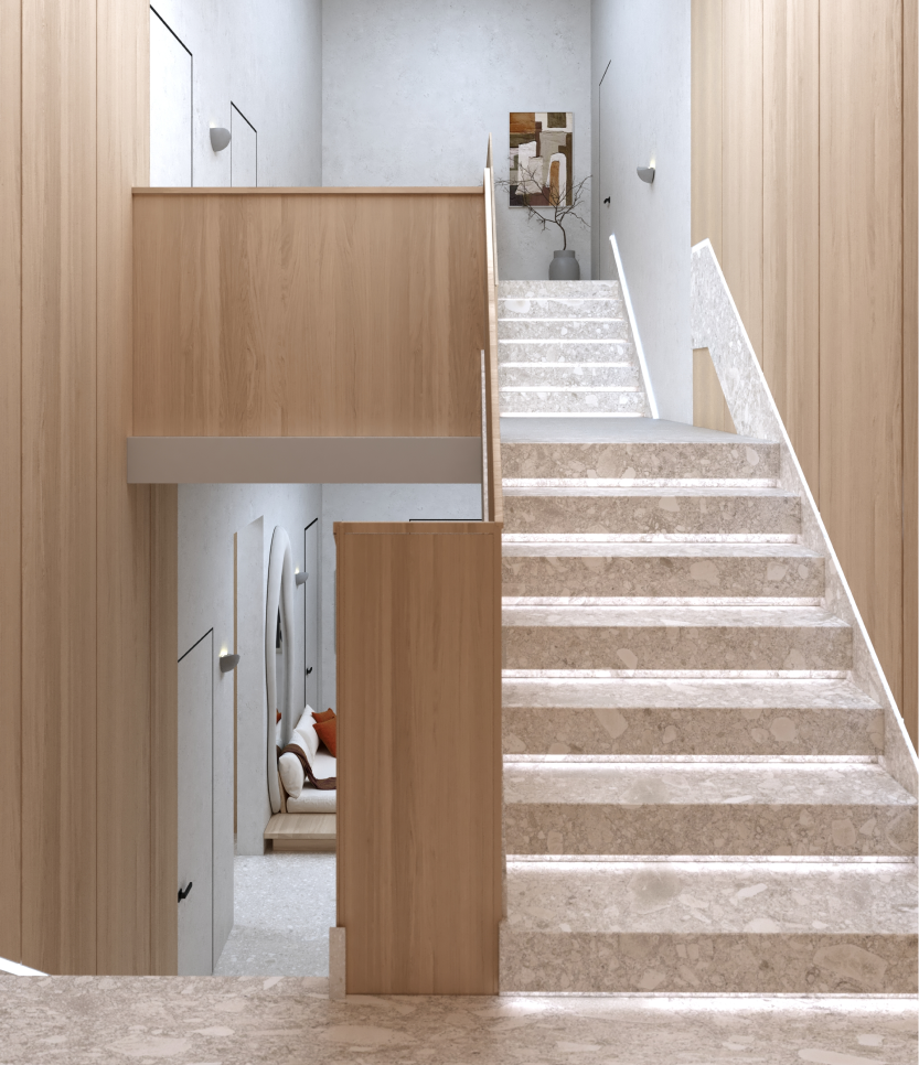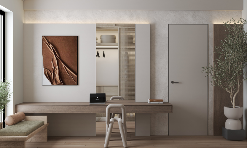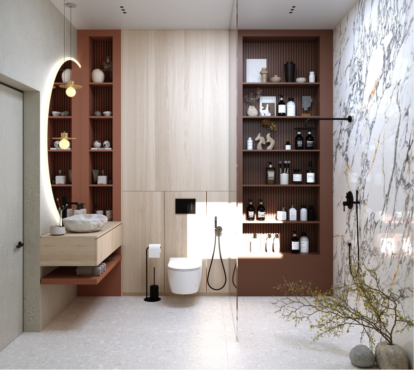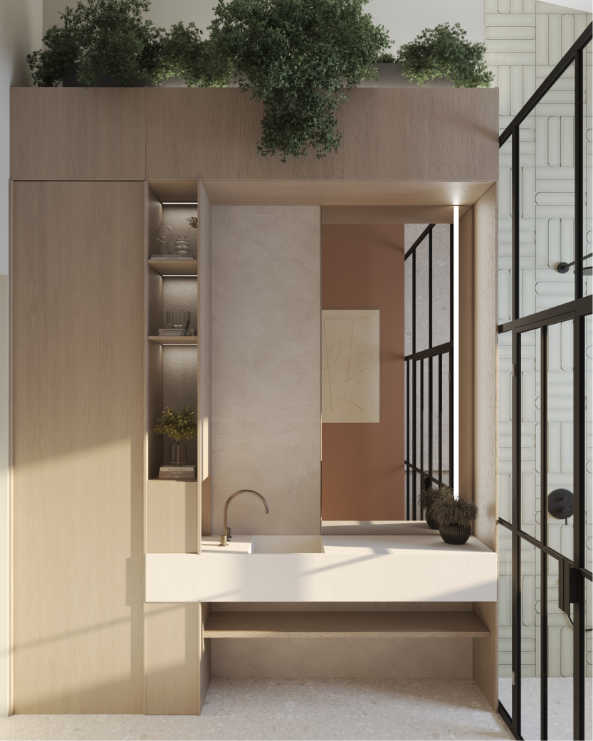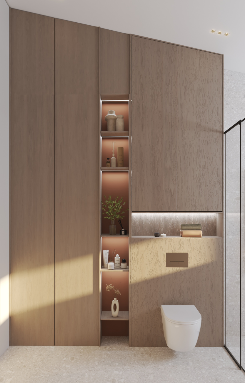 инженерная доска и дерево, а также приглушенные терракотовые акценты придают пространству особый стиль и уют.