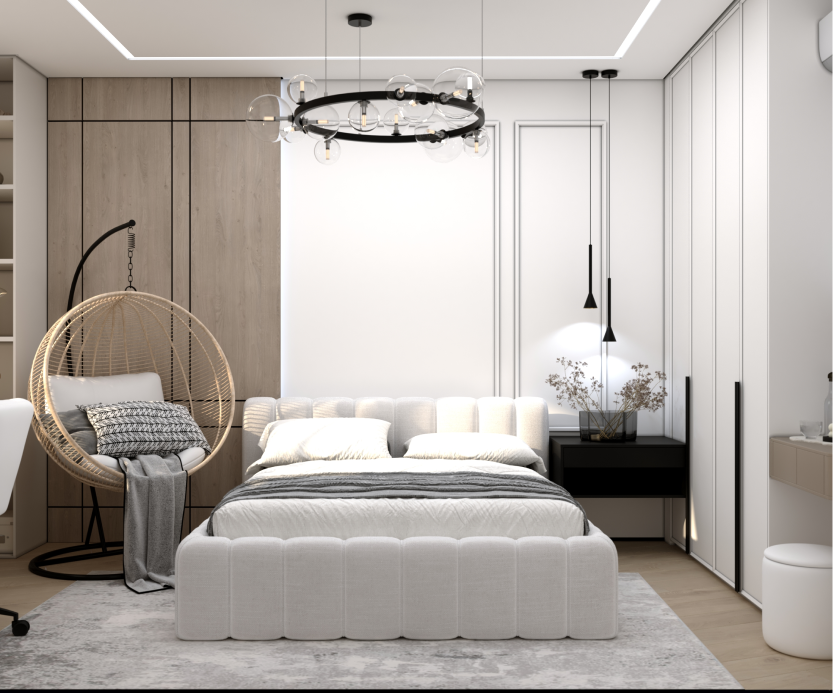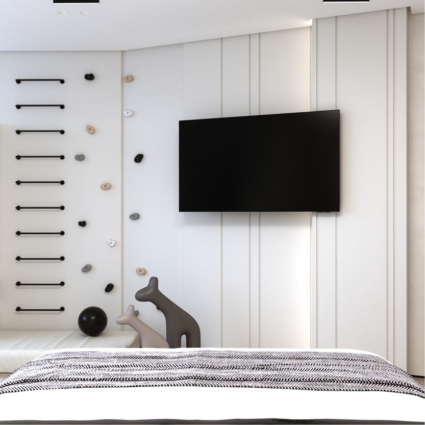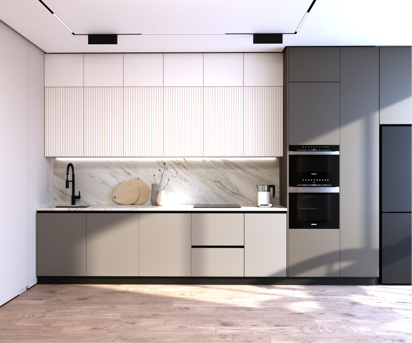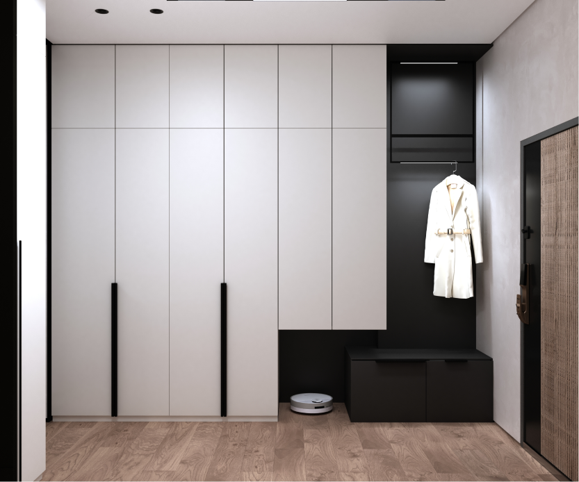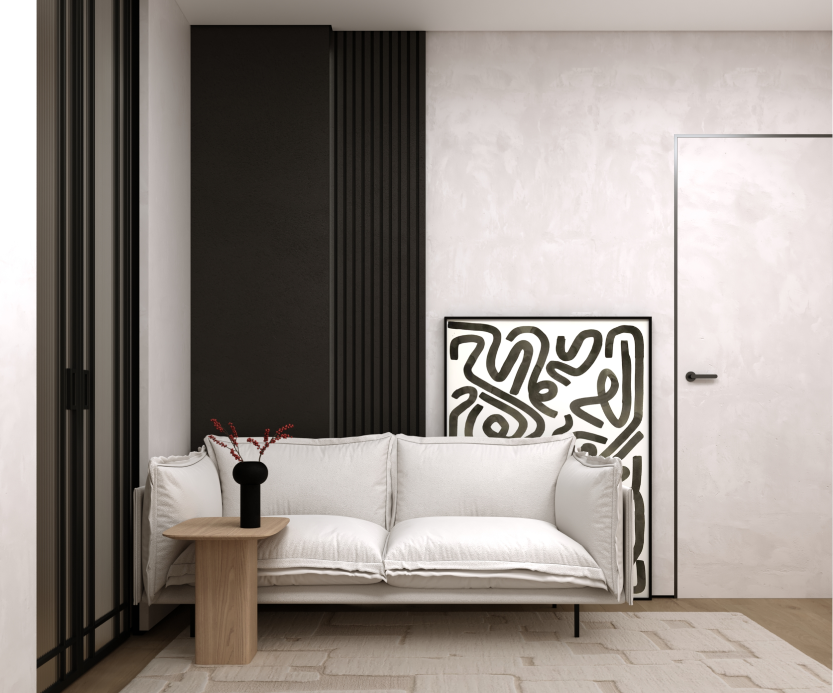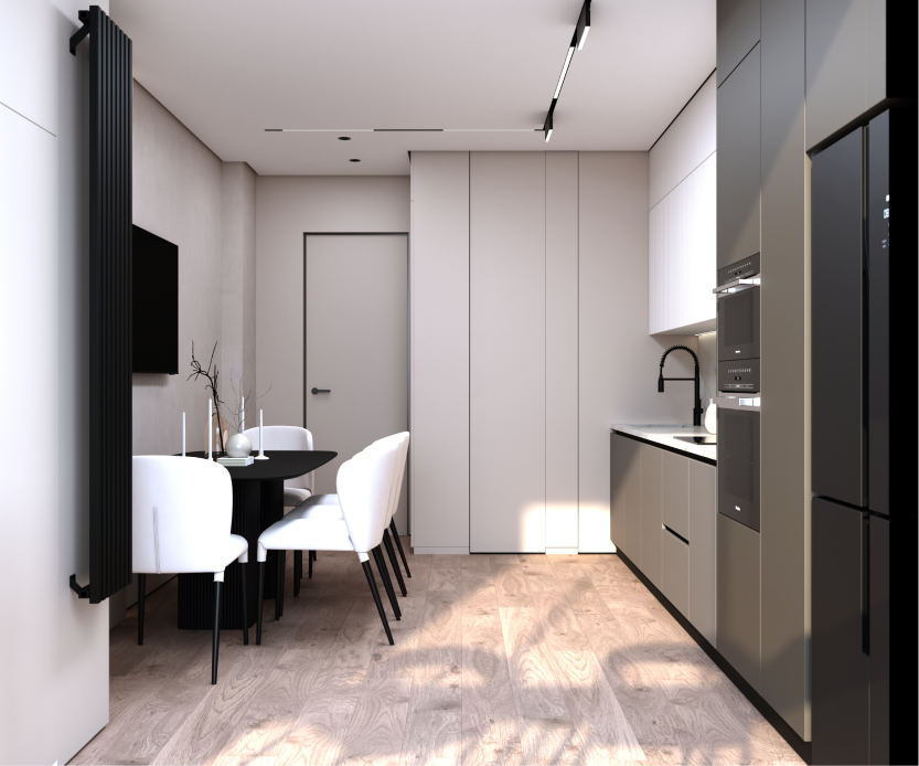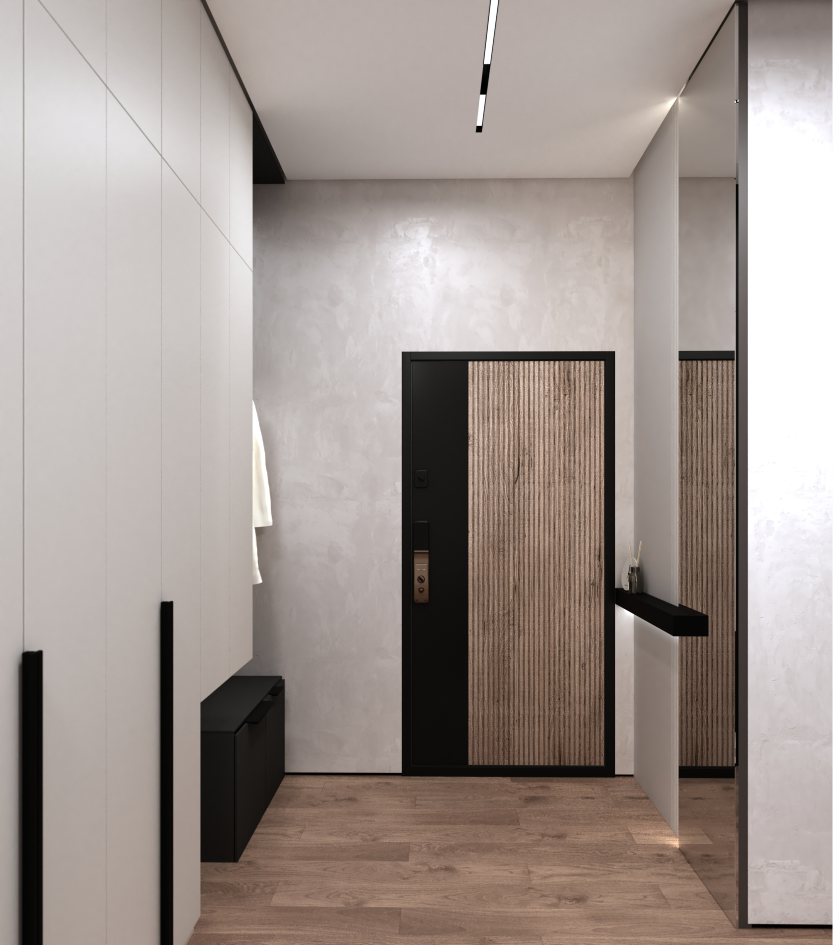 в монохромных оттенках с выразительными черными акцентами. В качестве декоративных элементов использованы стеновые панели, разработанные нашими специалистами по мебели