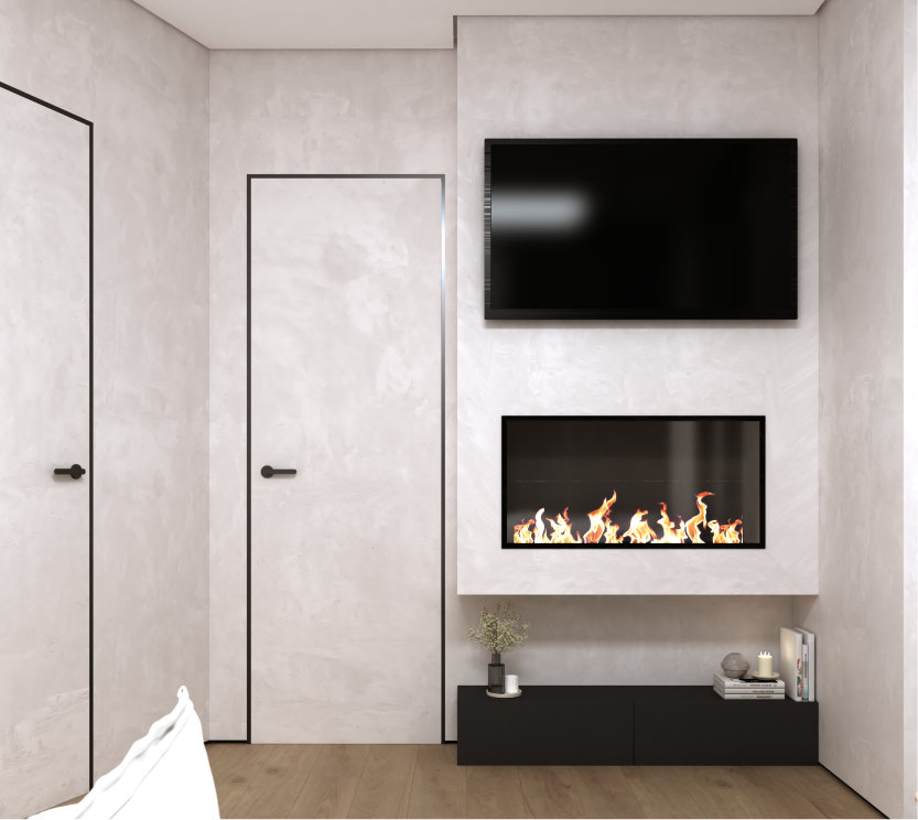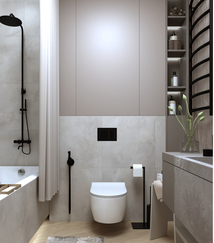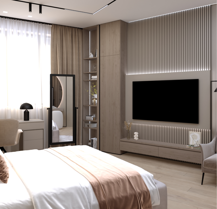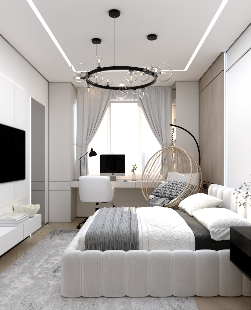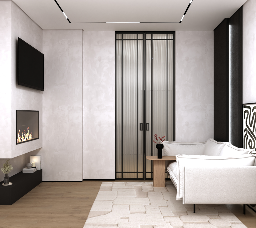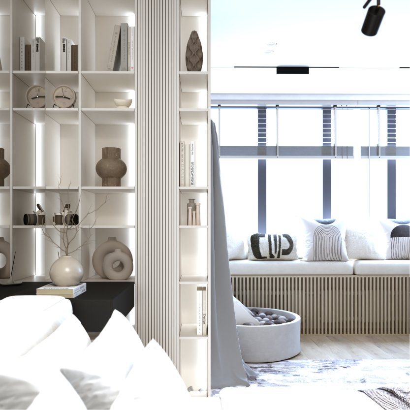 в монохромных оттенках с выразительными черными акцентами. В качестве декоративных элементов использованы стеновые панели, разработанные нашими специалистами по мебели