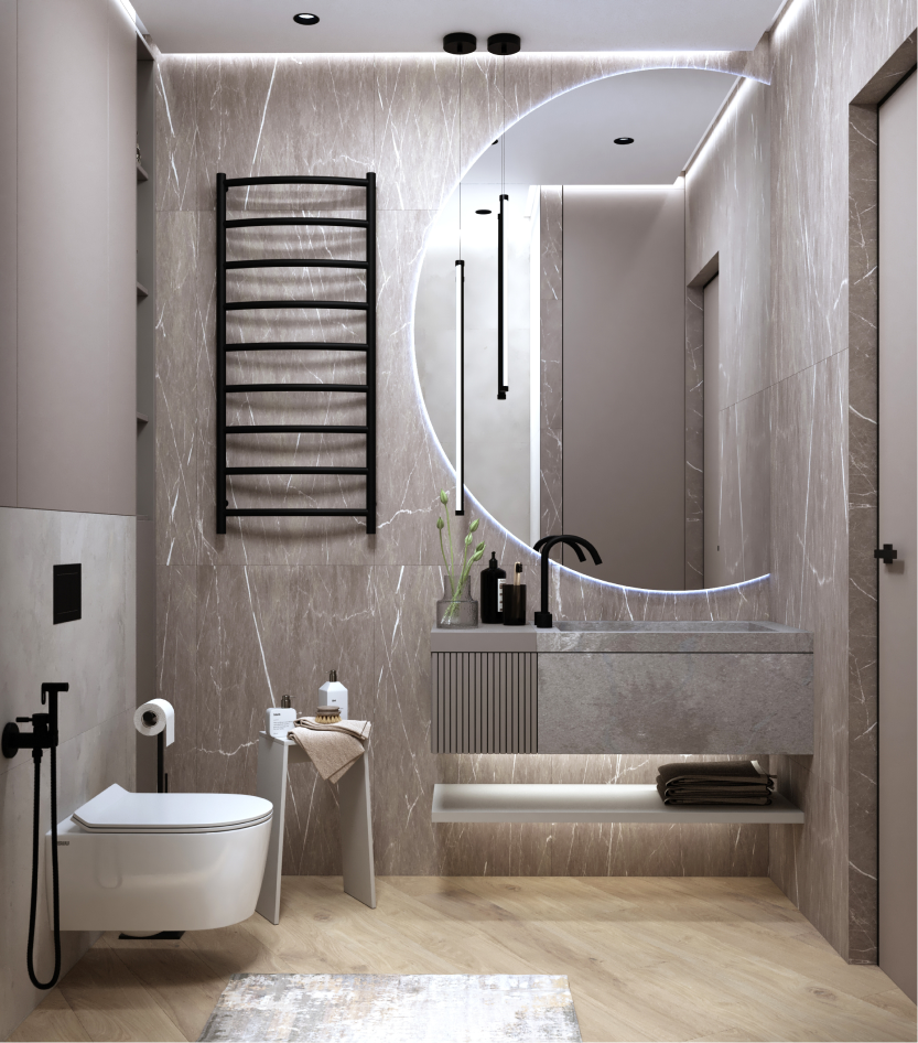 Современный интерьер с продуманной до мелочей электрикой. Основная палитра выполнена