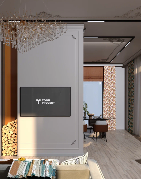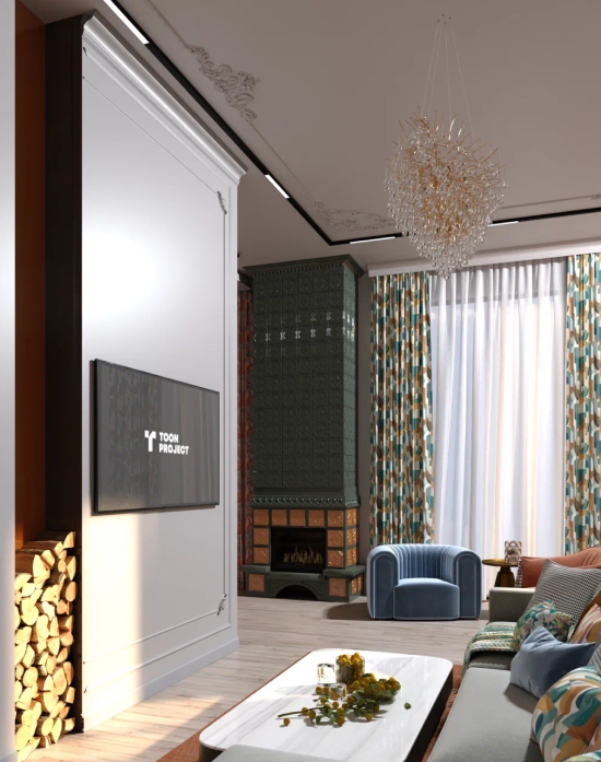 Этот дом почти 500 квадратных метров! Три этажа, где нижний этаж - огромная спа зона. Заказчица желала подчеркнуть русский стиль, поэтому в проекте много текстиля с принтами, камин с майоликой и даже прялка в гостиной. Интерьер должен был быть ярким,