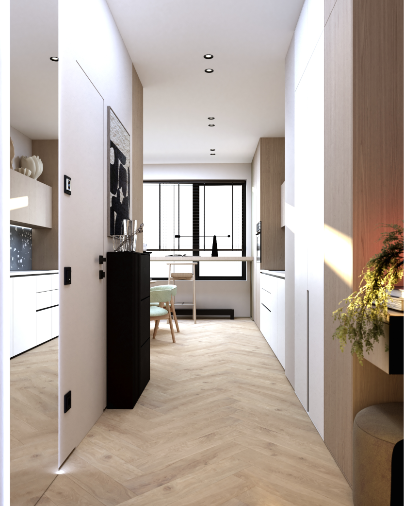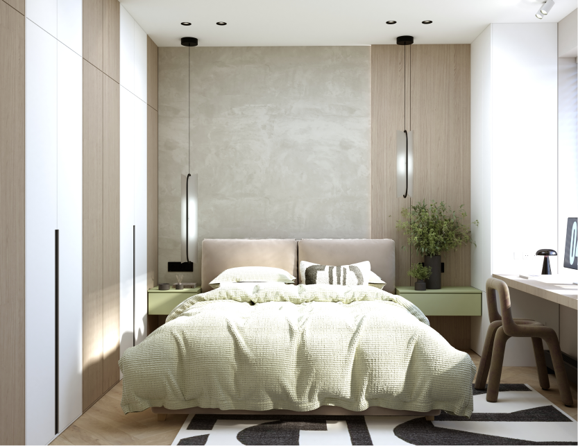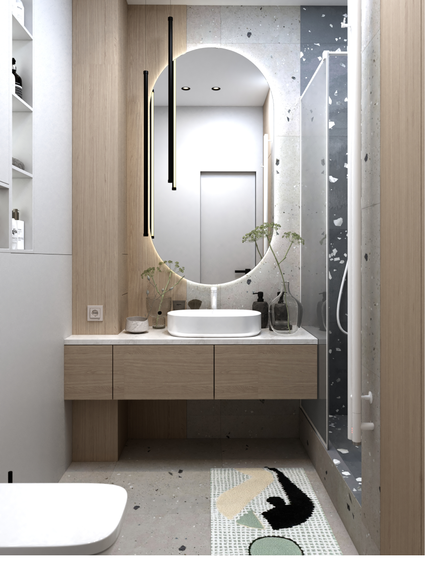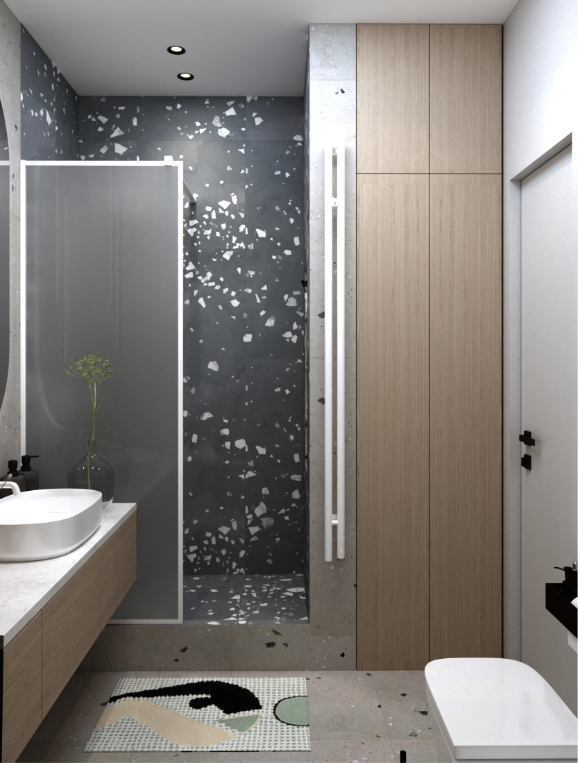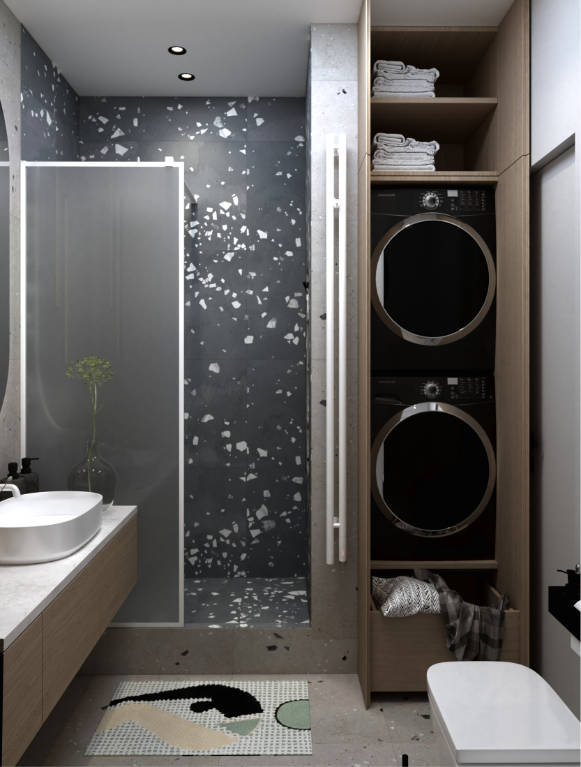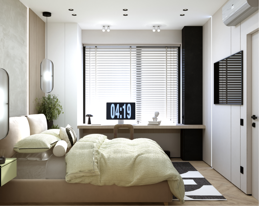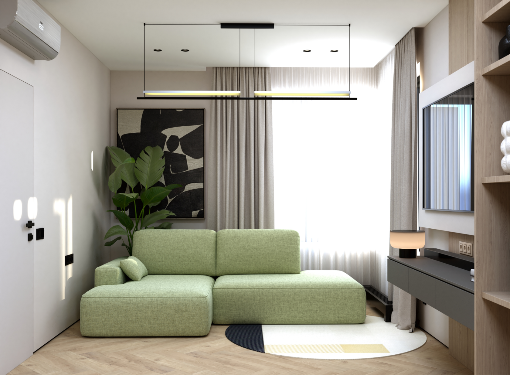 Современный интерьер с яркими акцентами. Мебель строгих форм, сложные оттенки серого и бежевого,