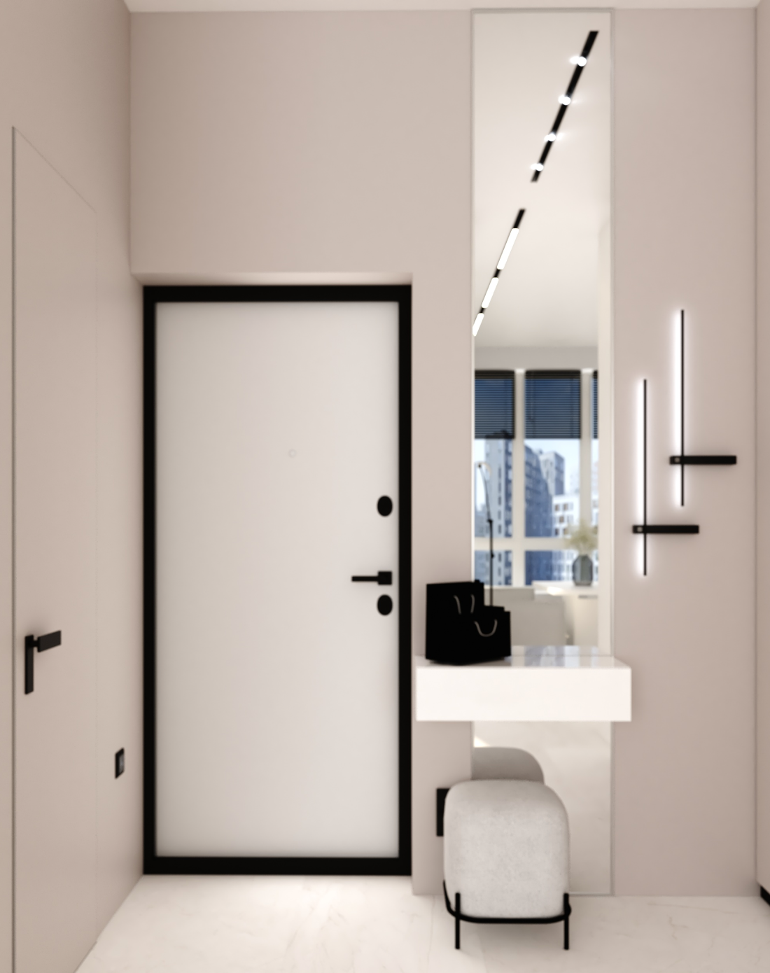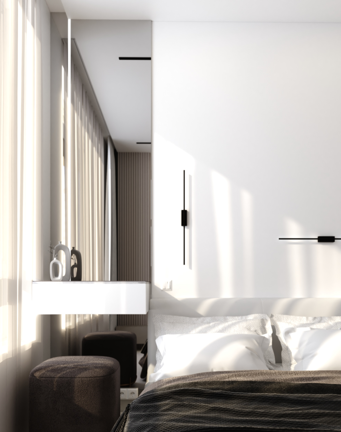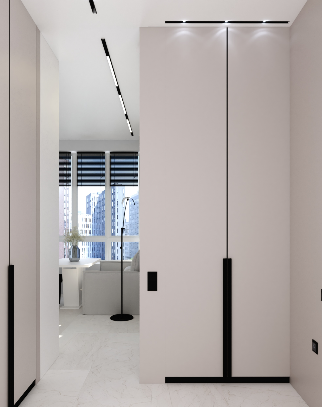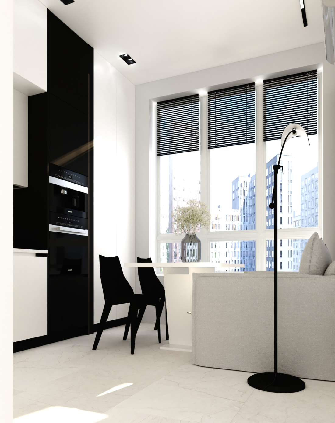и минималистичность ландшафта перенеслись и в минимализм интерьера для молодой семейной пары. И на 36 квадратных метрах мы впихнули невпихуемое.