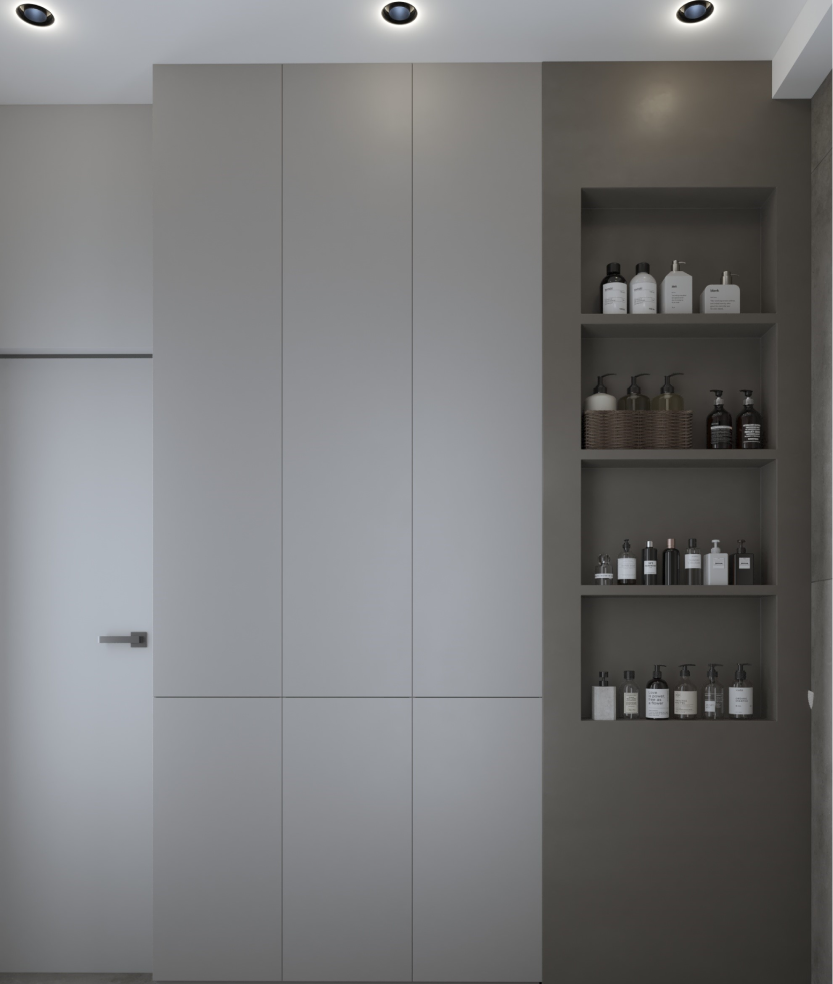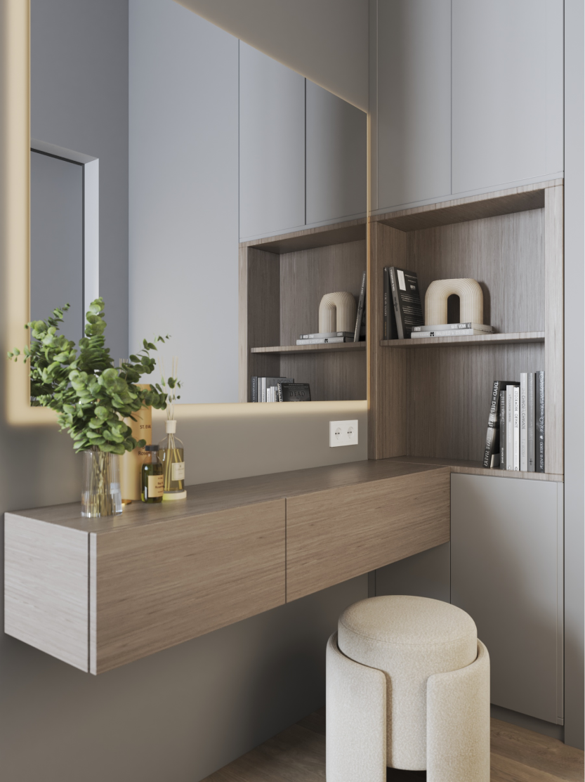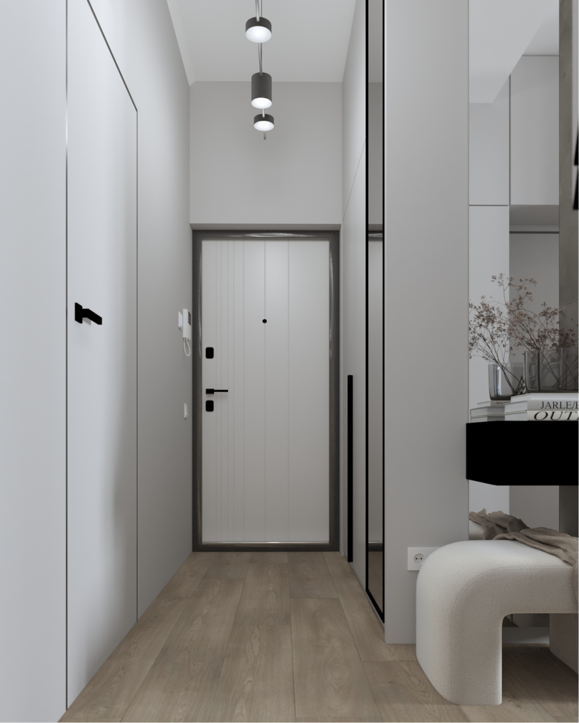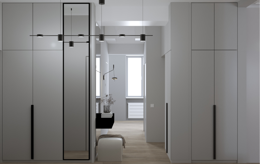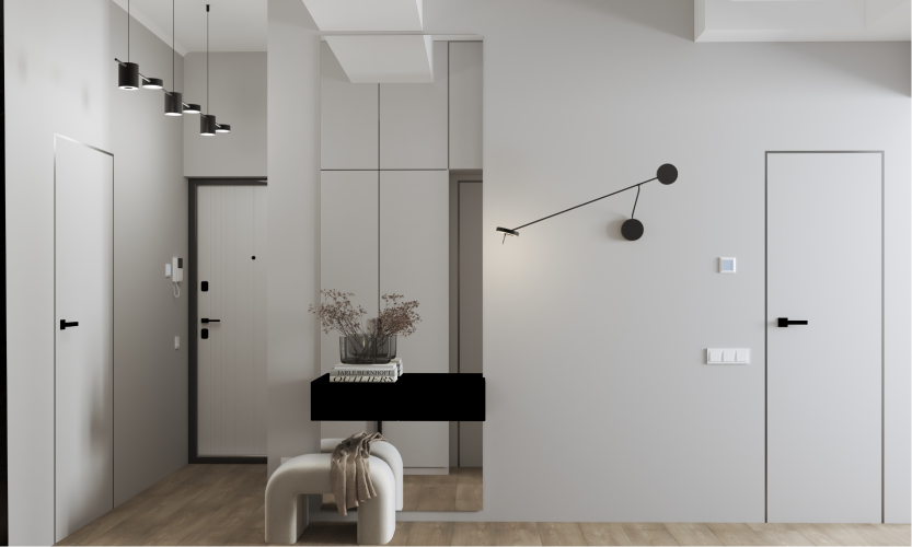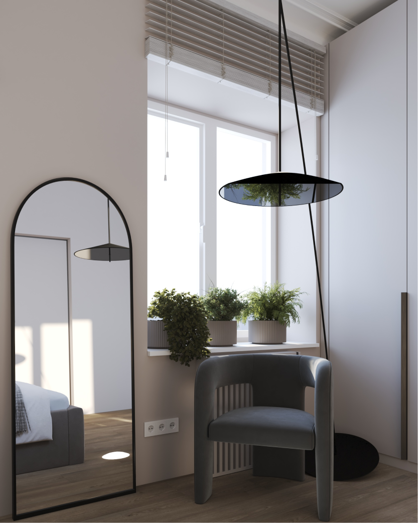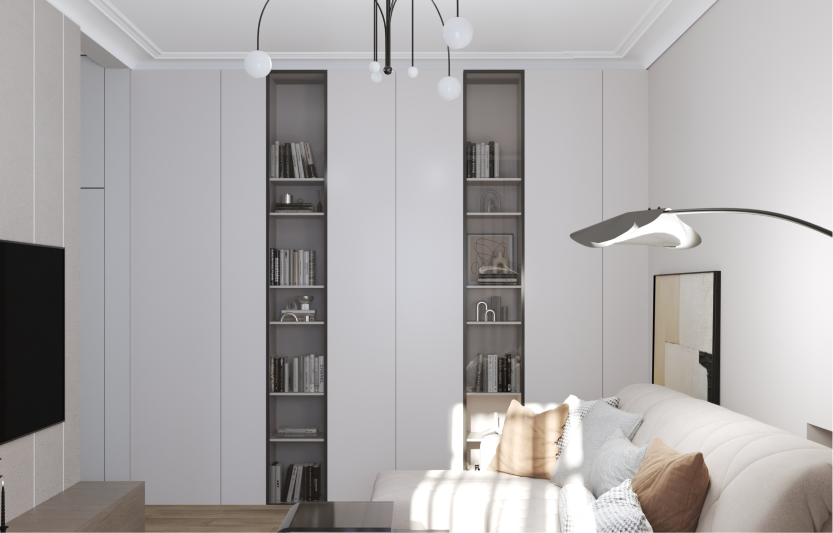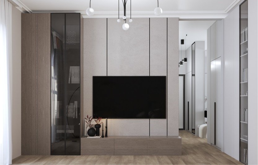 Минимализм в квартире старого фонда. Сохранившаяся лепнина, деревянные перекрытия и дымоход органично вписаны в интерьер в серо- бежевой гамме, подчеркивая уникальность и исторический дух пространства.