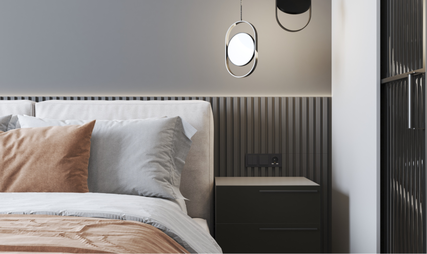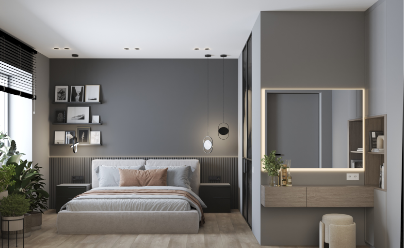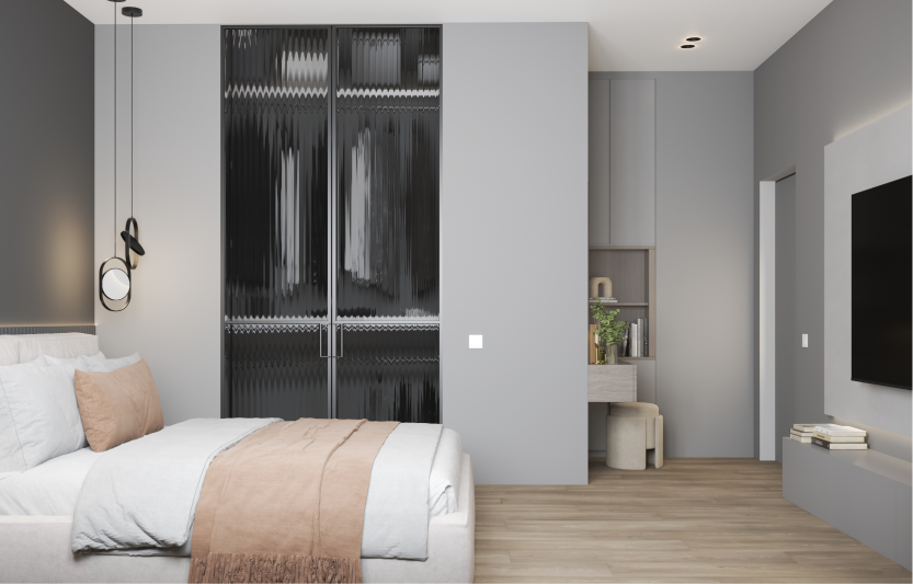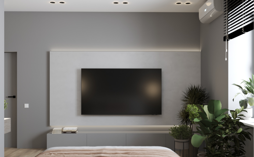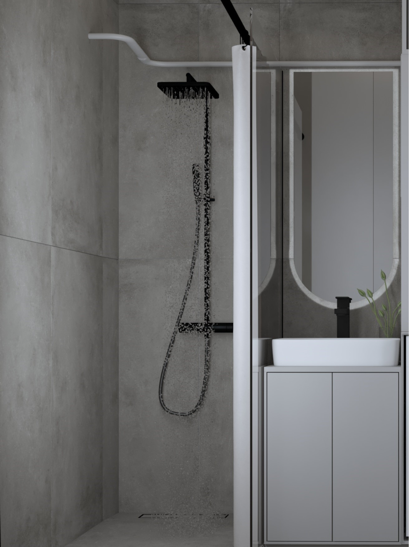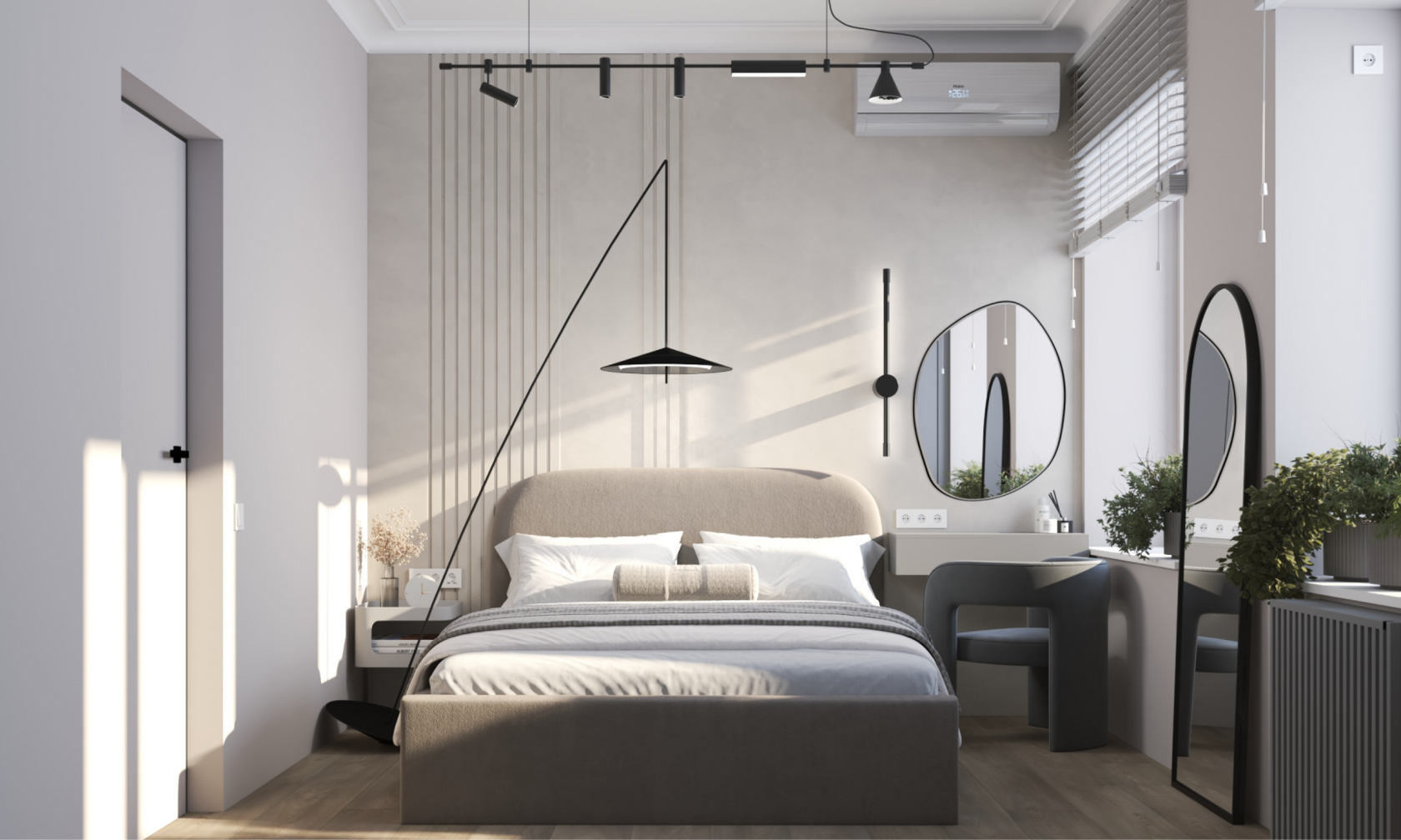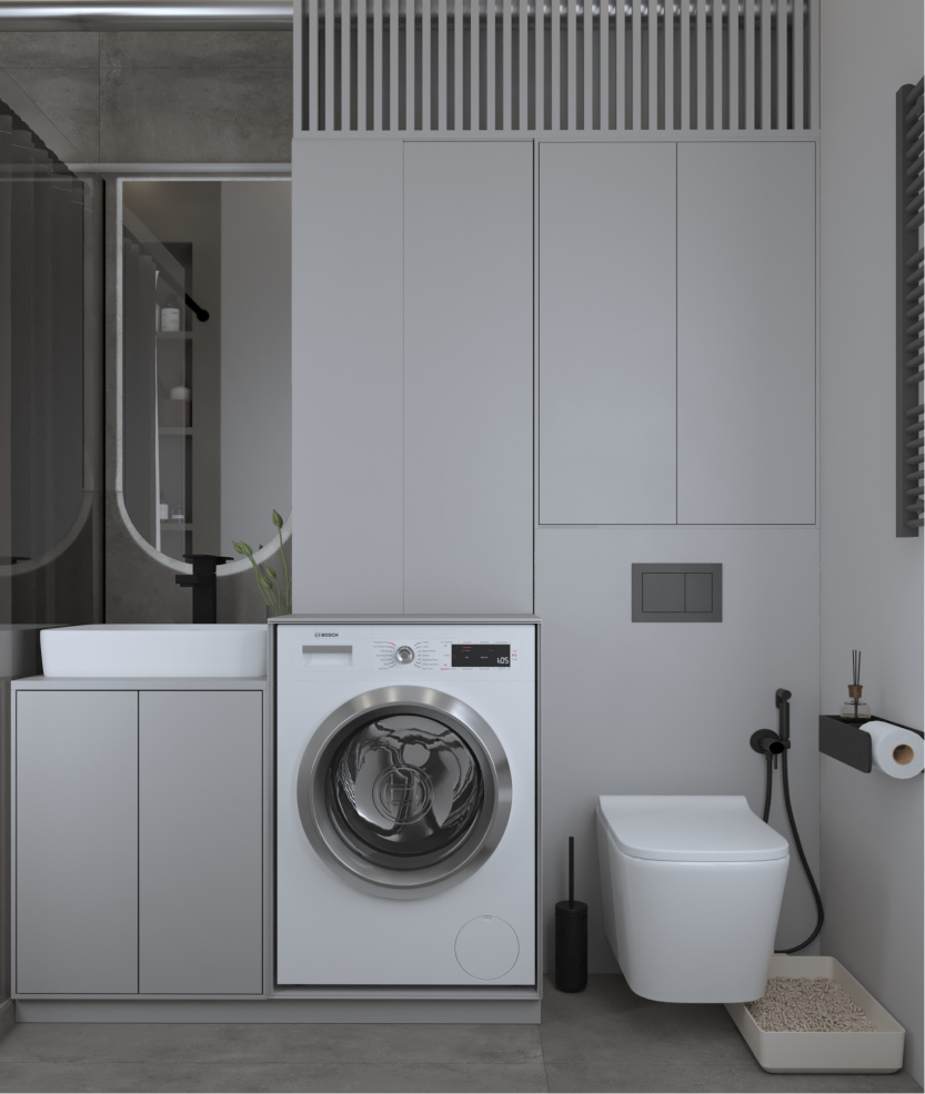 Минимализм в квартире старого фонда. Сохранившаяся лепнина, деревянные перекрытия и дымоход органично вписаны в интерьер в серо- бежевой гамме, подчеркивая уникальность и исторический дух пространства.