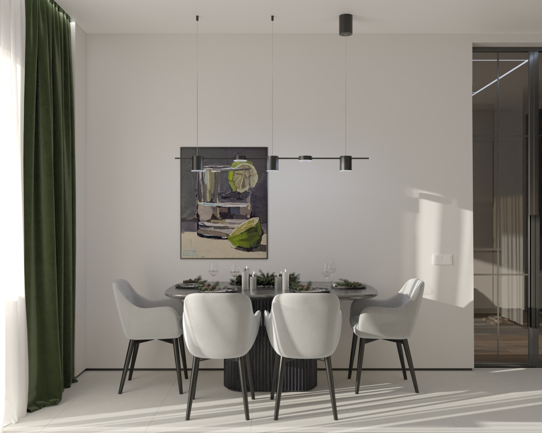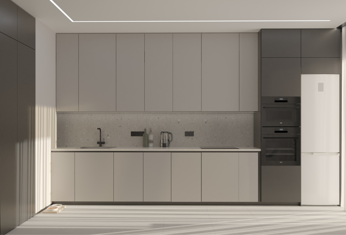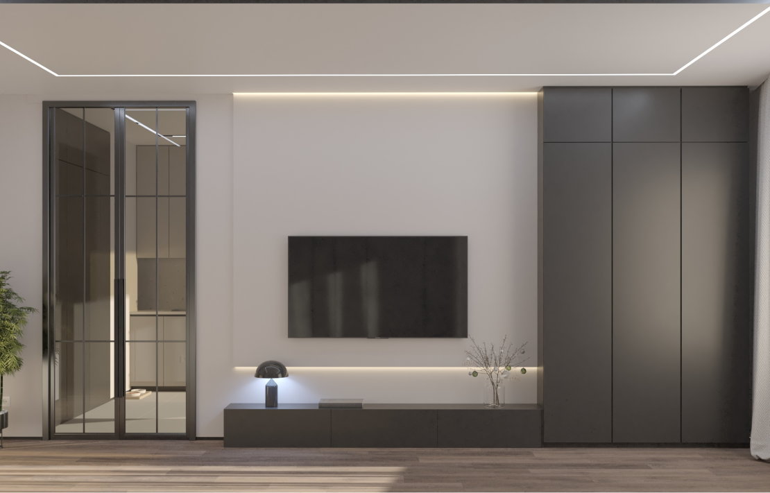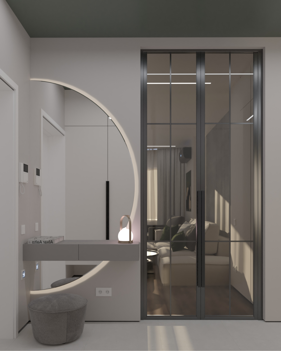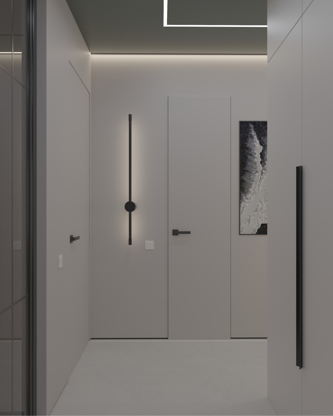 Этот интерьер был разработан полностью удаленно, и в Пскове он заслуженно считается одним из самых красивых. Монохромная гамма, теневой потолок и плинтус, световые линии — все это подчеркивает минимализм, создавая гармоничную и стильную атмосферу.