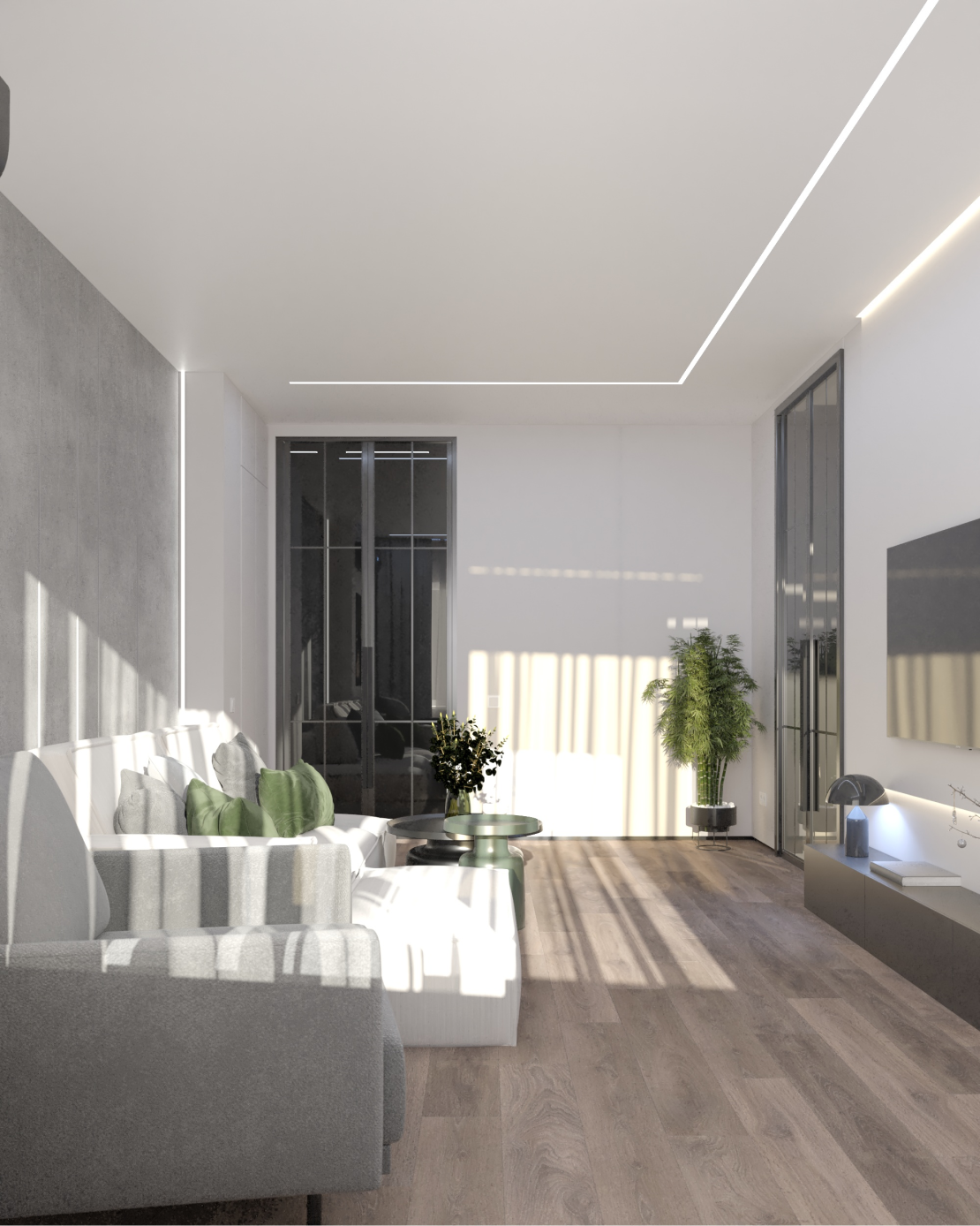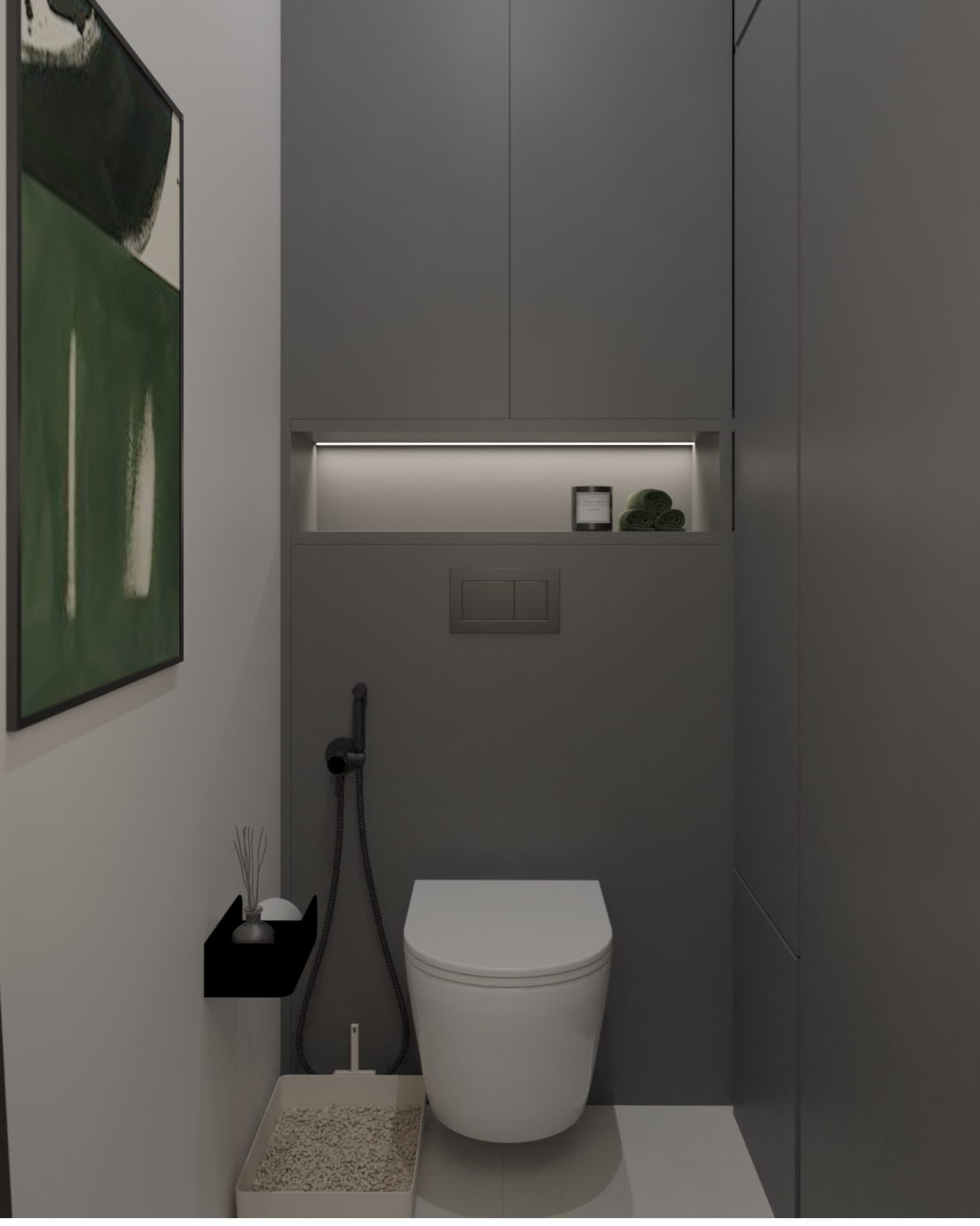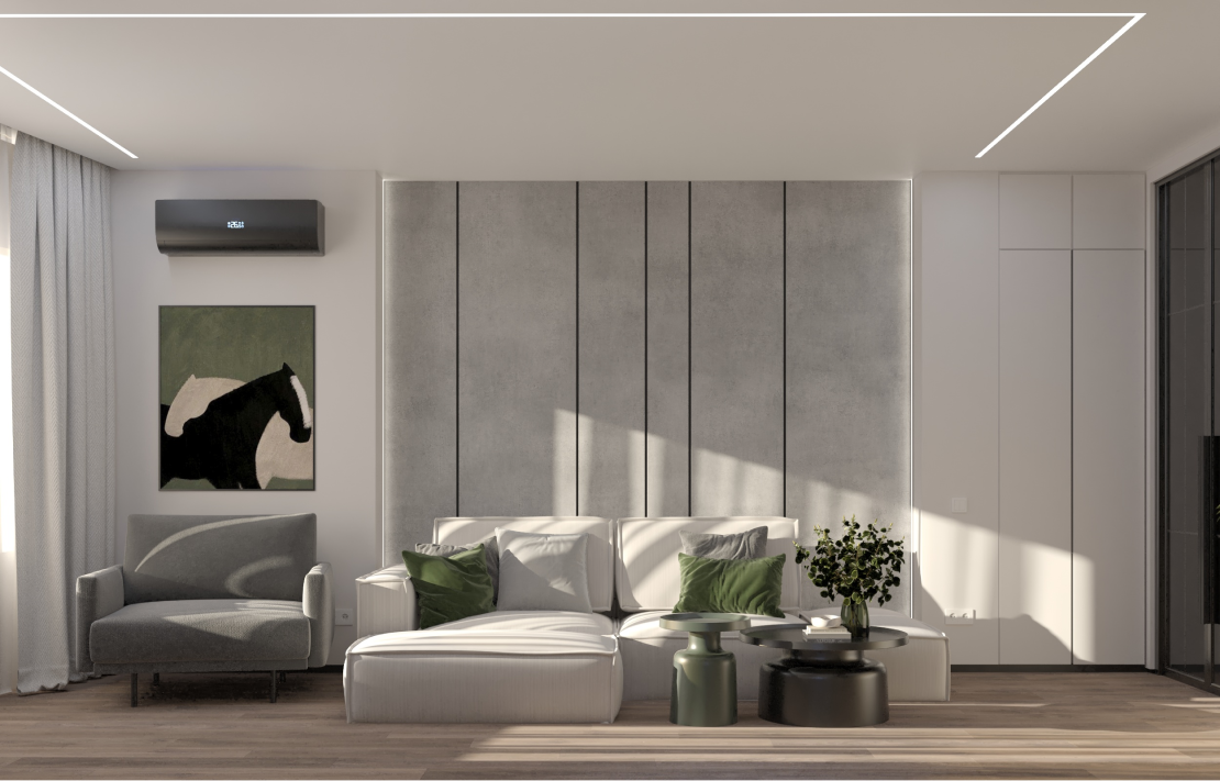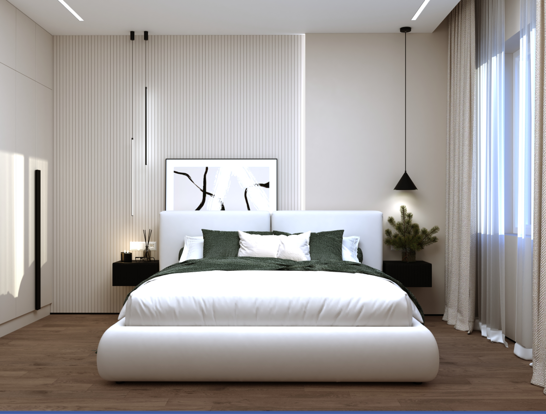 Этот интерьер был разработан полностью удаленно, и в Пскове он заслуженно считается одним из самых красивых. Монохромная гамма, теневой потолок и плинтус, световые линии — все это подчеркивает минимализм, создавая гармоничную и стильную атмосферу.